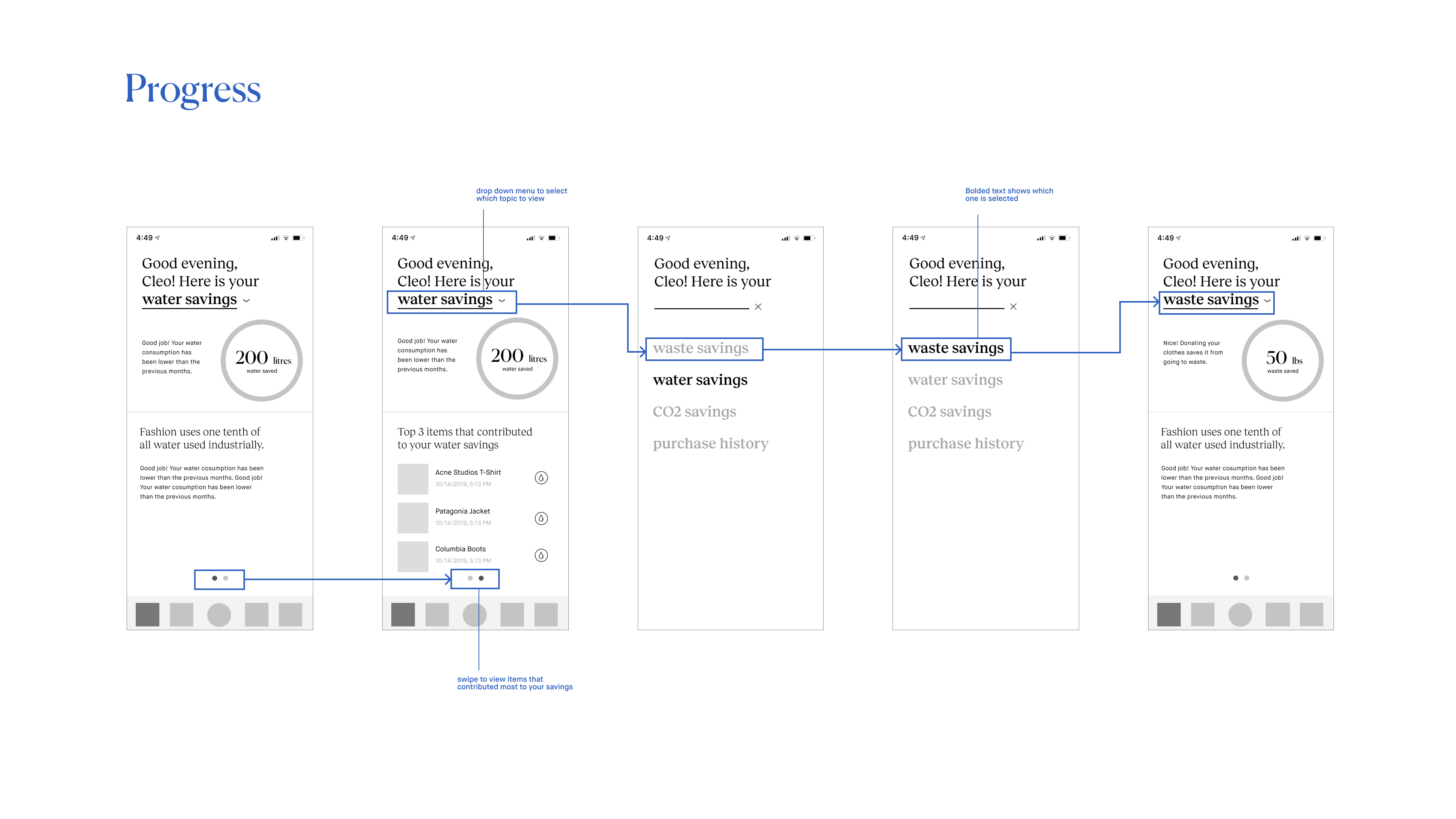 Preliminary wireframe flows of the home progress page.