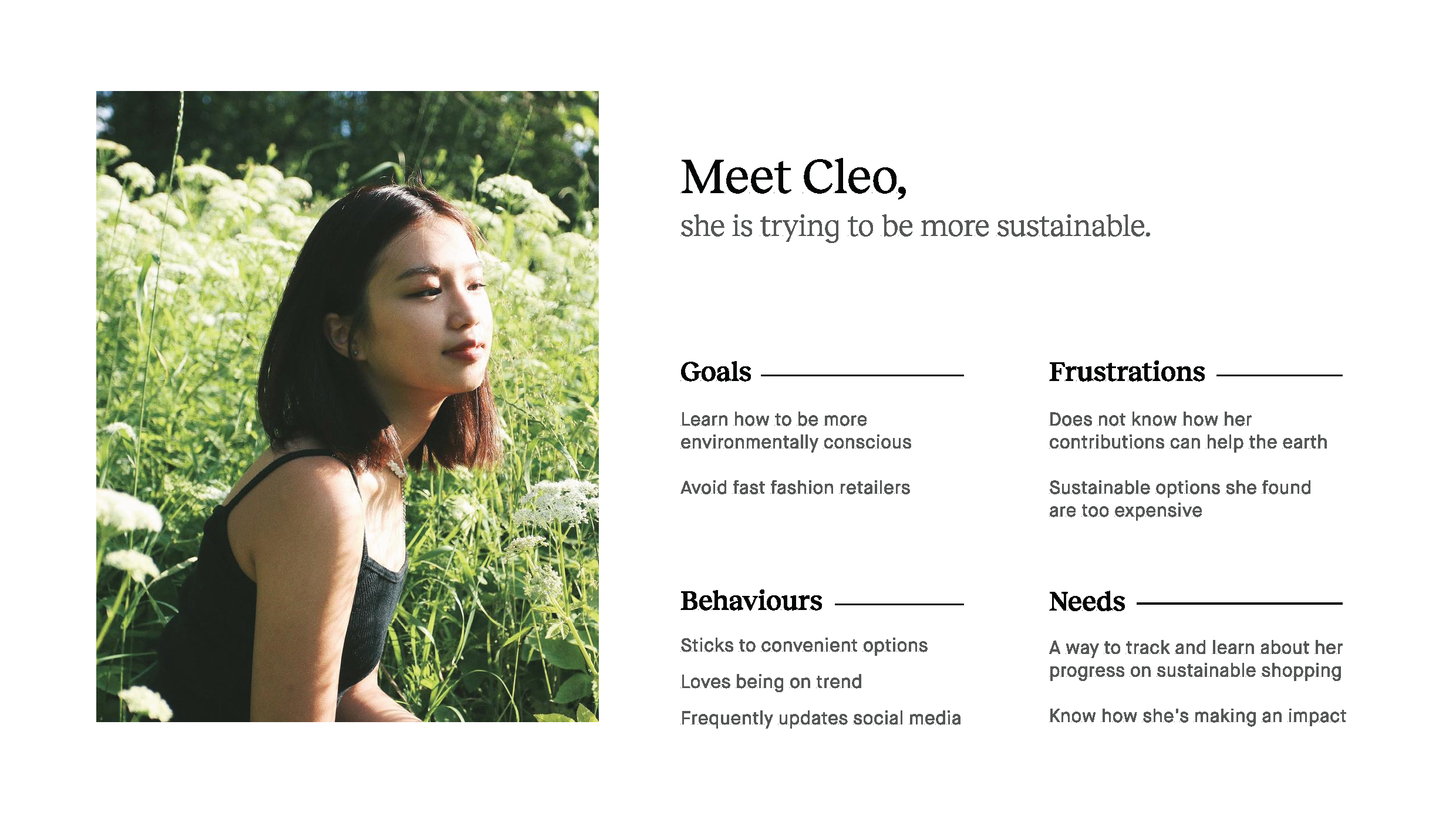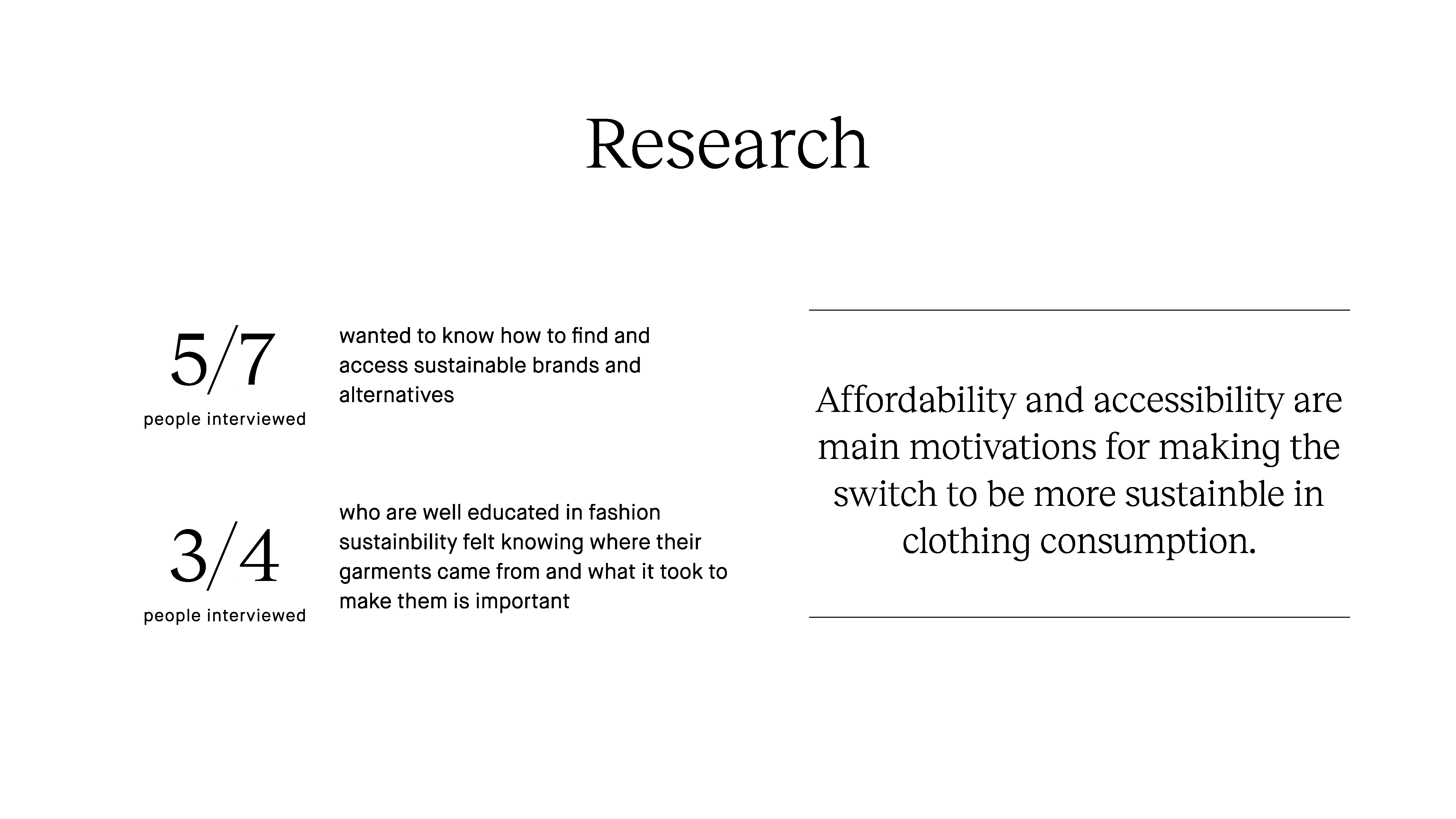 From our research, we were able to identify patterns of goals, frustrations and behaviors that allowed us to better understand how we can improve and move forward with creating a better experience of sustainable fashion for people. Some key insights that led us to our end goal include:
