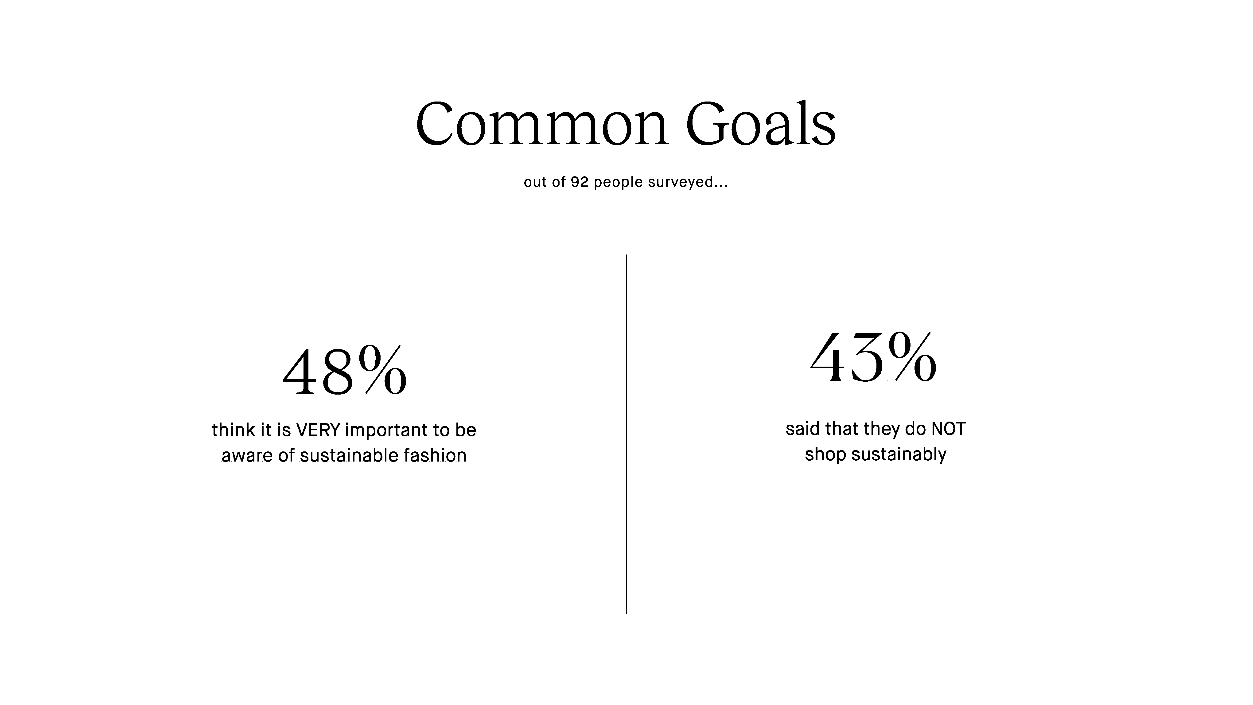 This project consisted of two research phases. Our initial research began with conducting a survey and multiple interviews to investigate the various views of fashion sustainability. We surveyed a group of 92 people ranging from ages 18 – 70 and asked them questions related to their previous fashion sustainability knowledge and experiences.